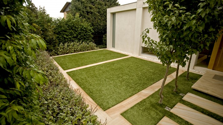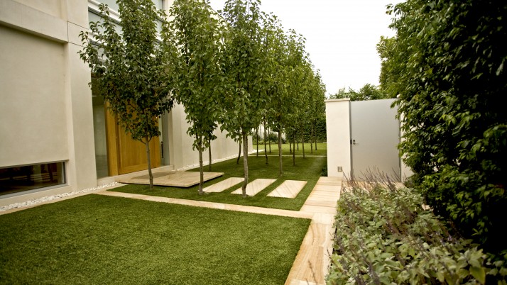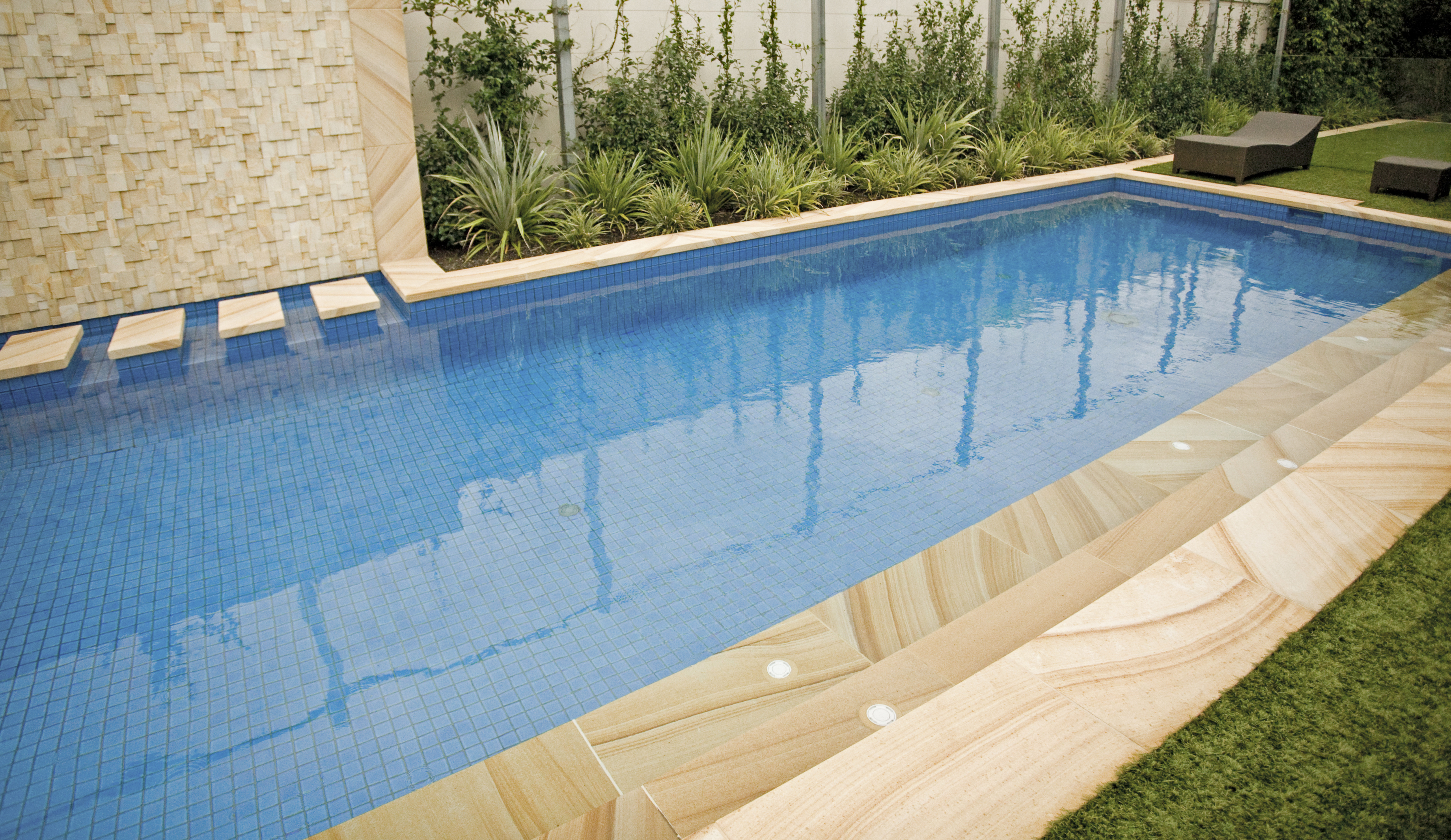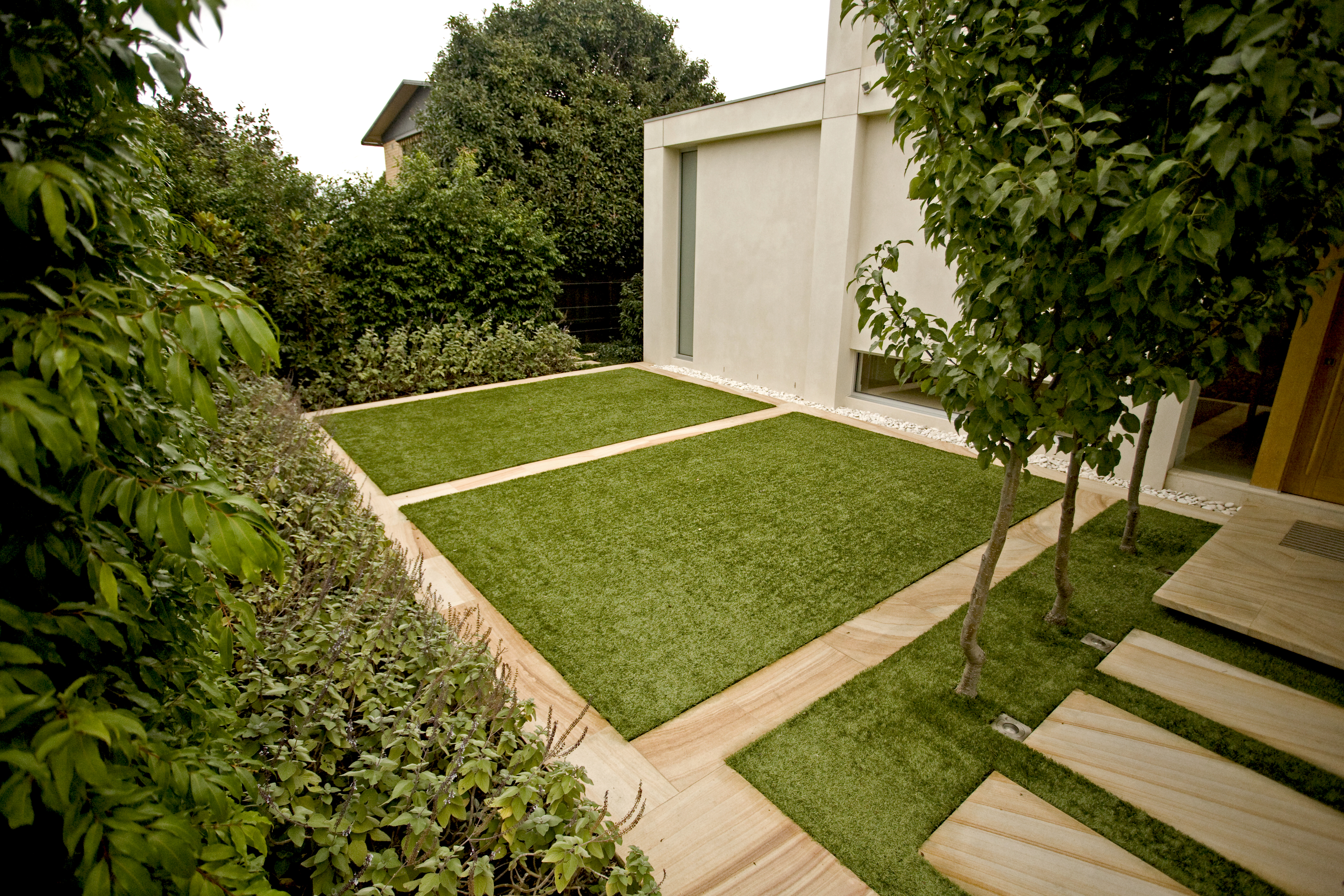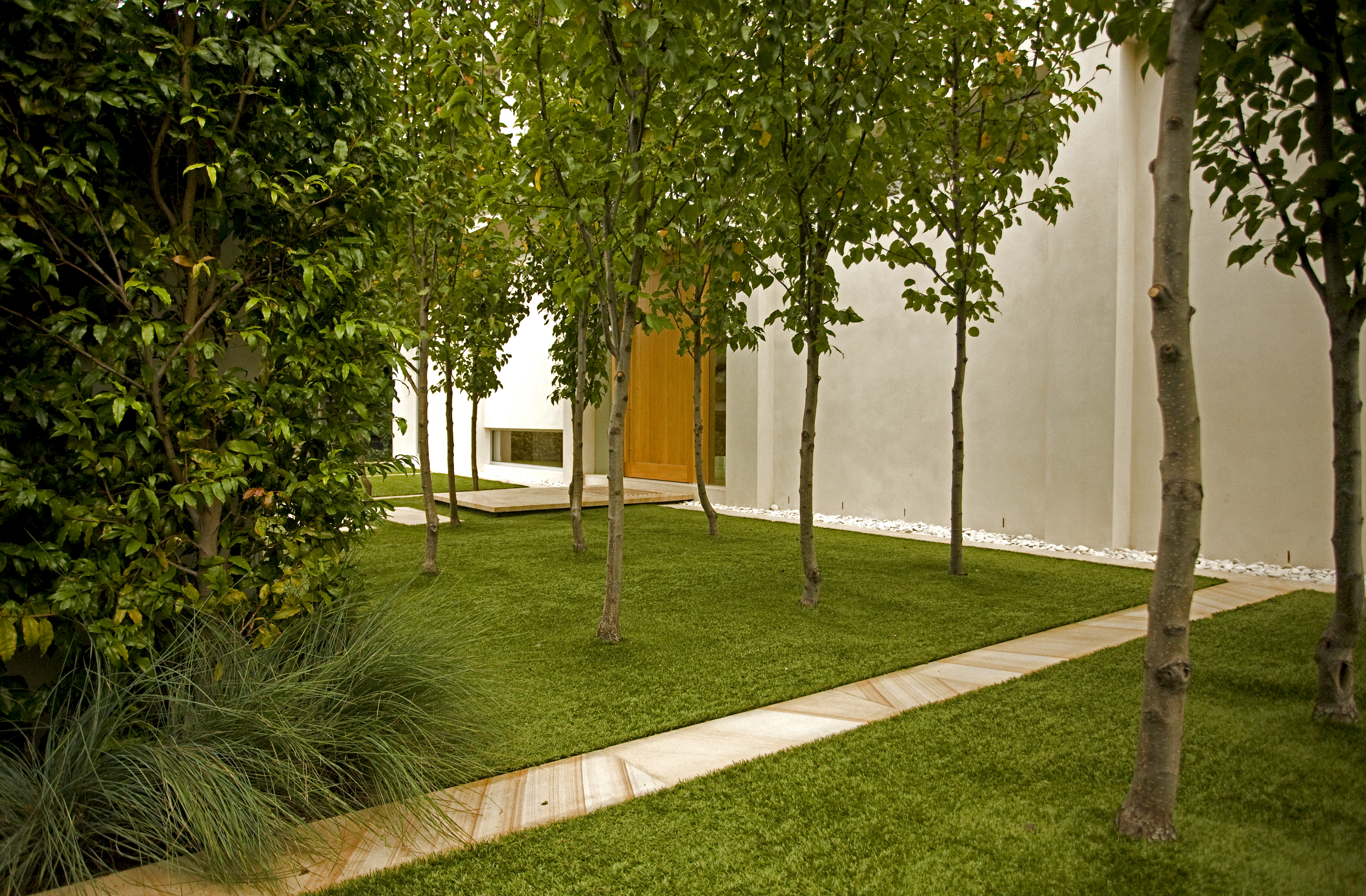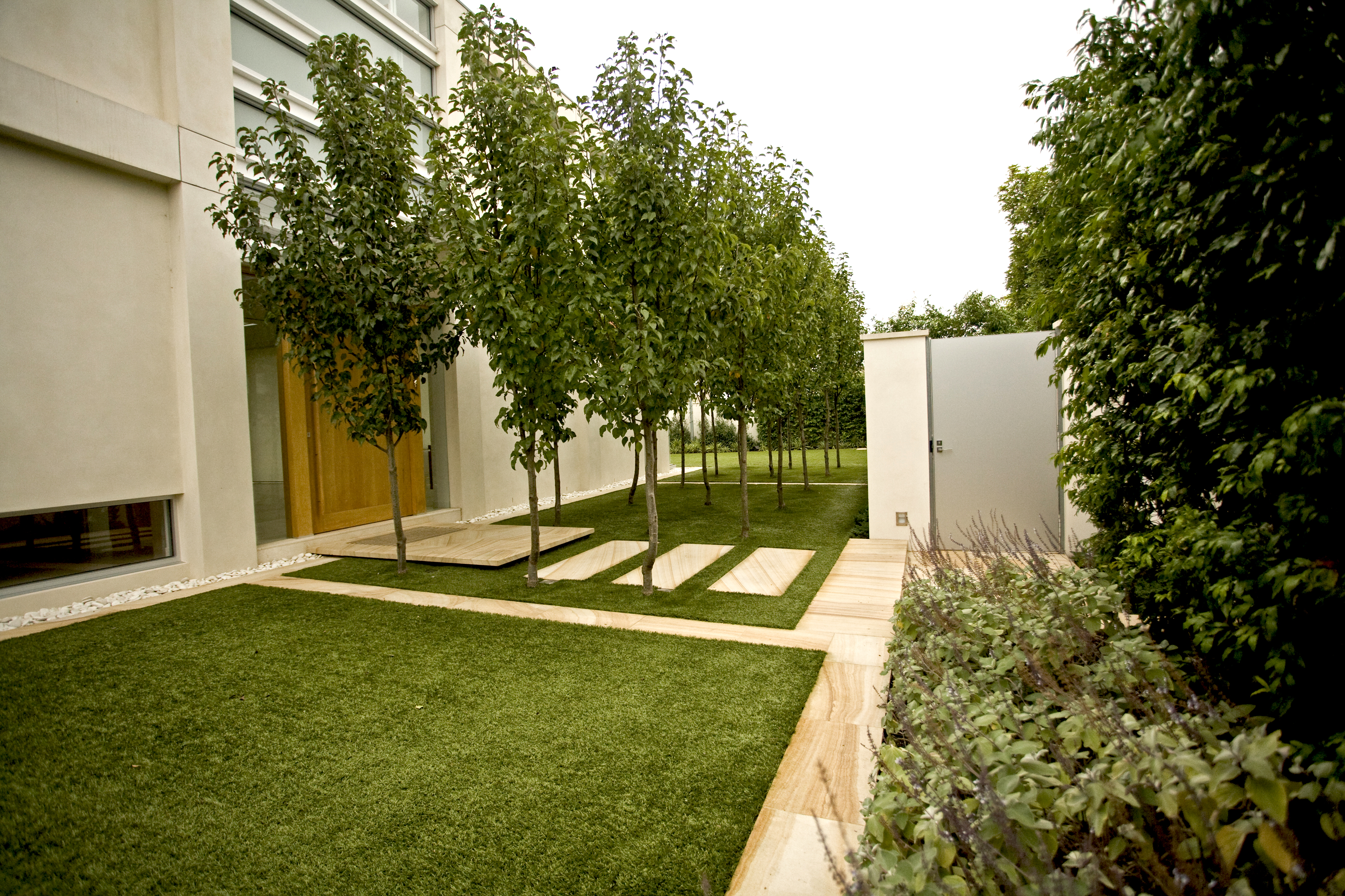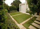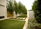 Our clients wanted to create a modern minimalist garden in sympathy with their new architect designed residence & including large areas for entertaining and family recreation, and a pool. Built on a main road; high garden walls enclose the space creating a series of walled gardens, reducing traffic noise and creating privacy. The main entry is via a formal copse of ornamental pear trees set in a turfed courtyard. Sandstone banding breaks up the lawn creating a rhythm in sympathy with the architecture. Planting is strong, a minimal palette to reflects the modern design.