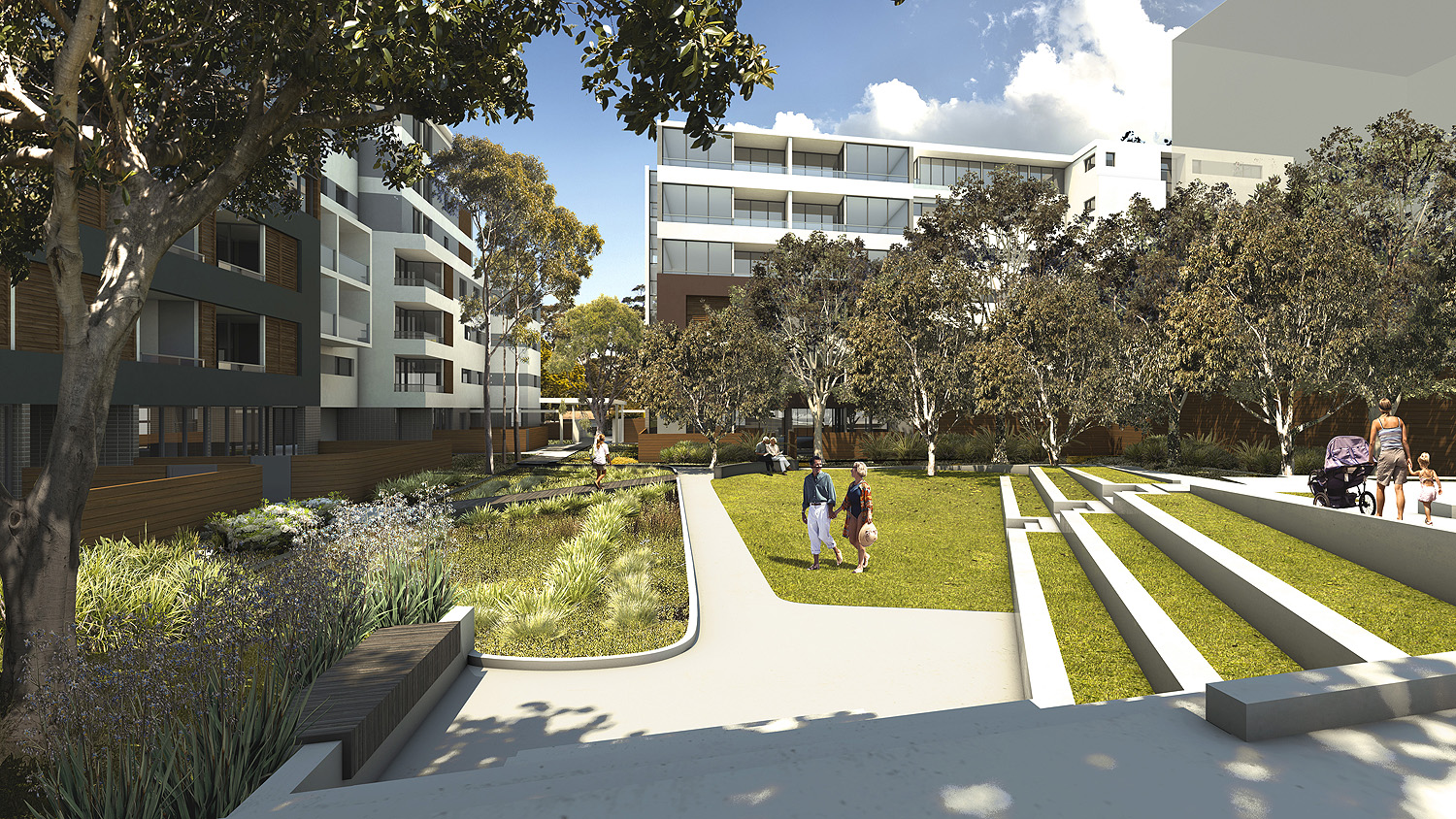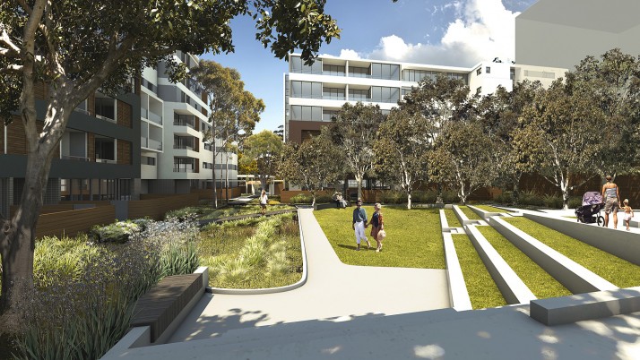 …areas and bench seating with paved areas for table arrangements. The central Village Green is set out with a series of grassed sitting edges overlooking the lawn, ephemeral water areas and garden beds breakaway seating is provided at the base of the stair and the far end of the lawn. A secondary lawn and seating area is located alongside the under croft area and set against a lush generous planted backdrop that also forms a buffer to nearby unit’s private courtyards. A timber decked bridge structure spans the ephemeral water element and creates a visual point of interest within the Village Green areas.