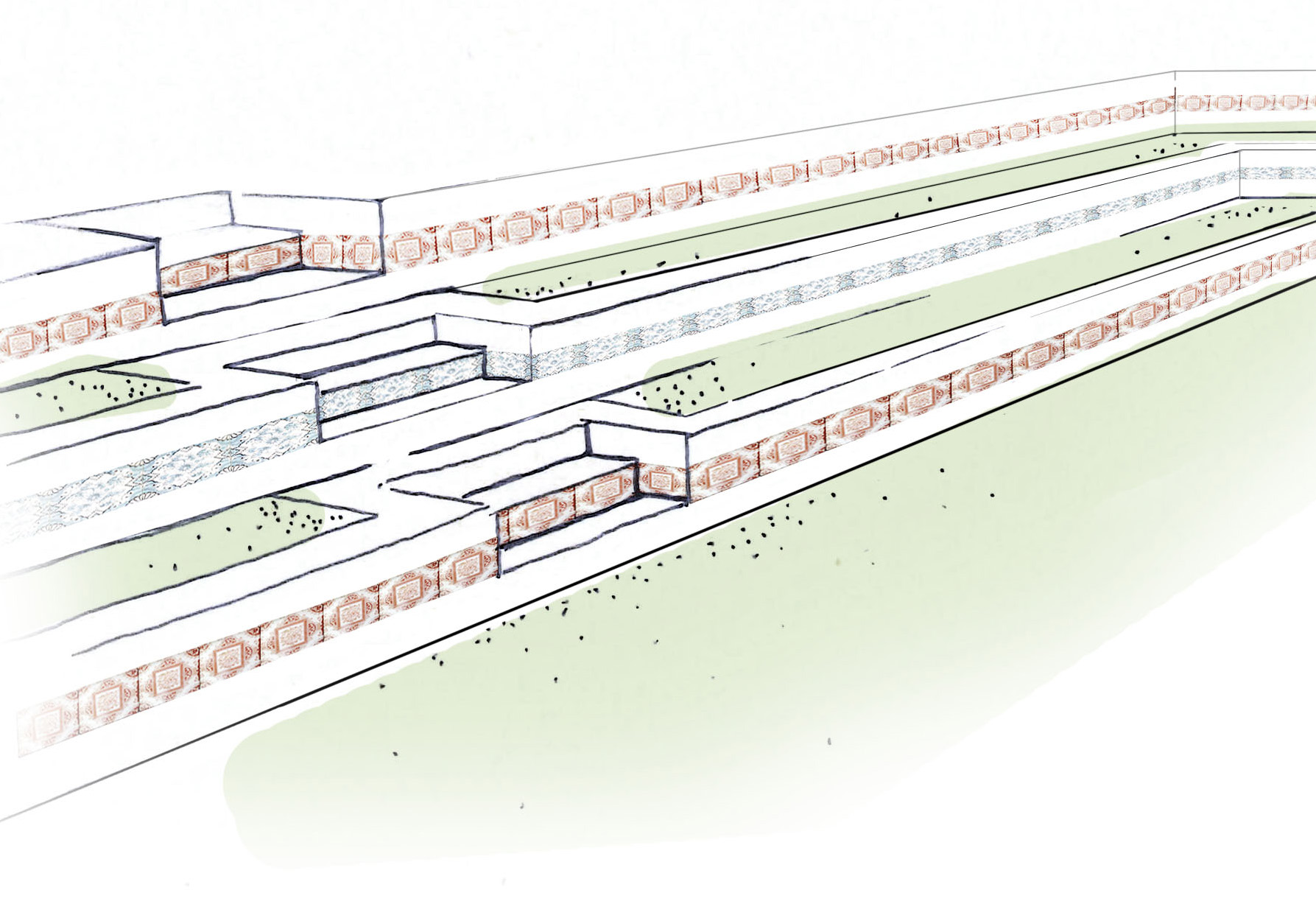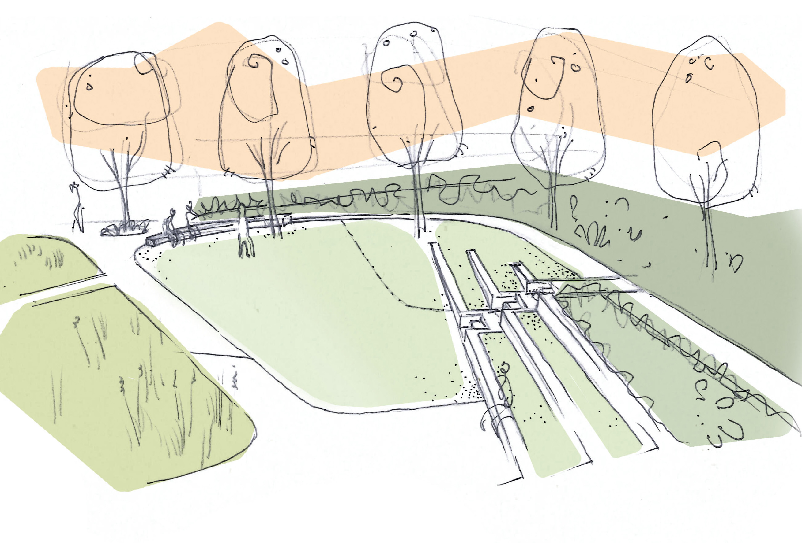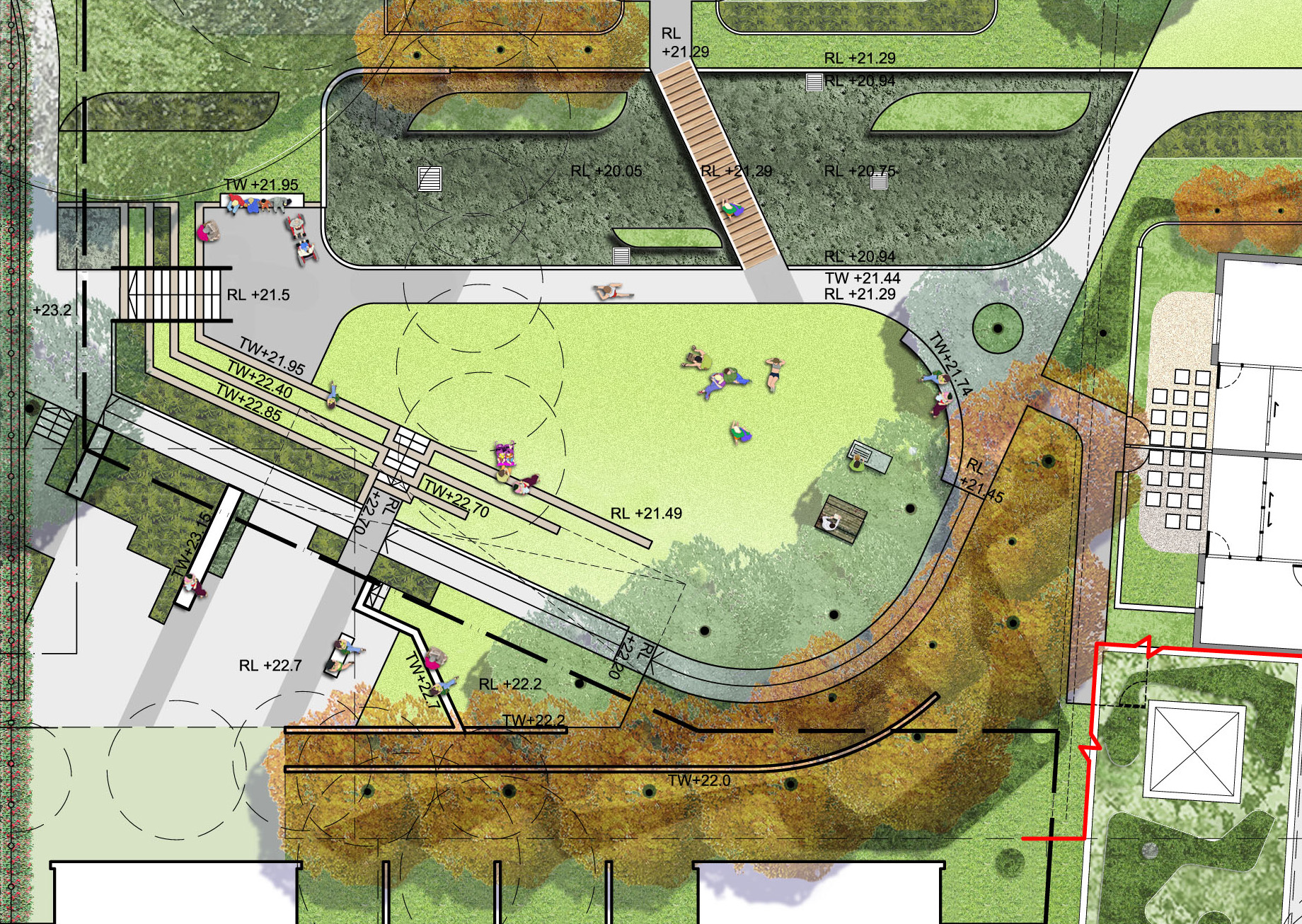 A series of separated or small group passive recreation areas located around the central terraced Village Green. All areas are provided with good general visual and surveillance access while creating separated niches and framed views when seated. A future external under croft area will provide a breakout space for inclement weather complete with planted…