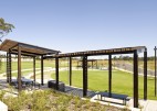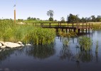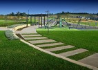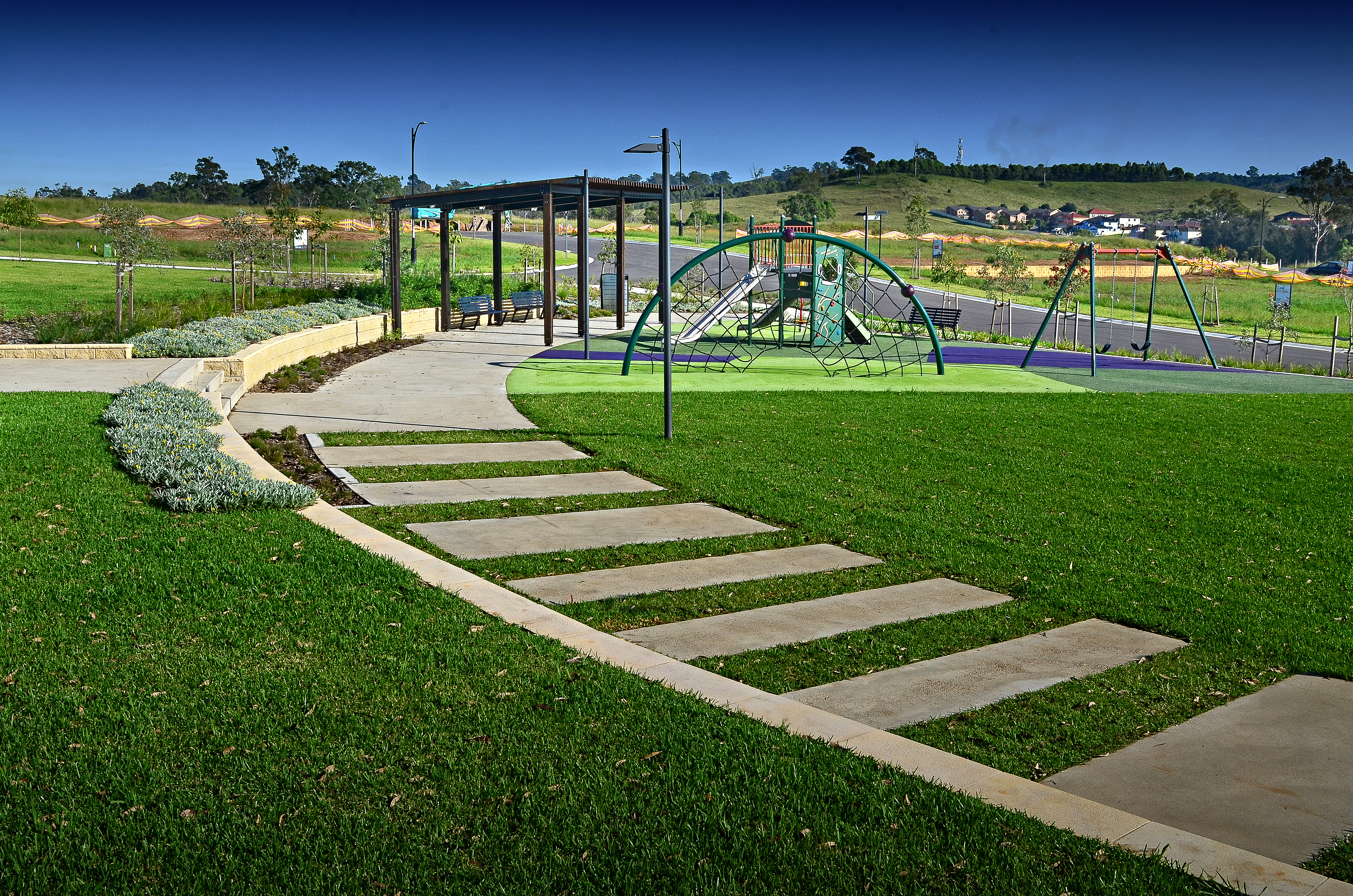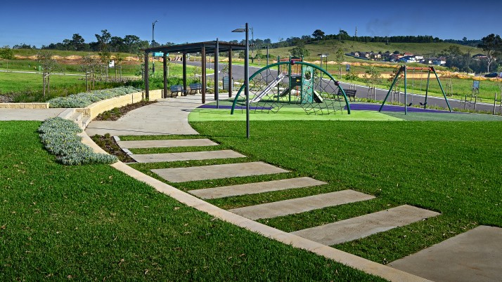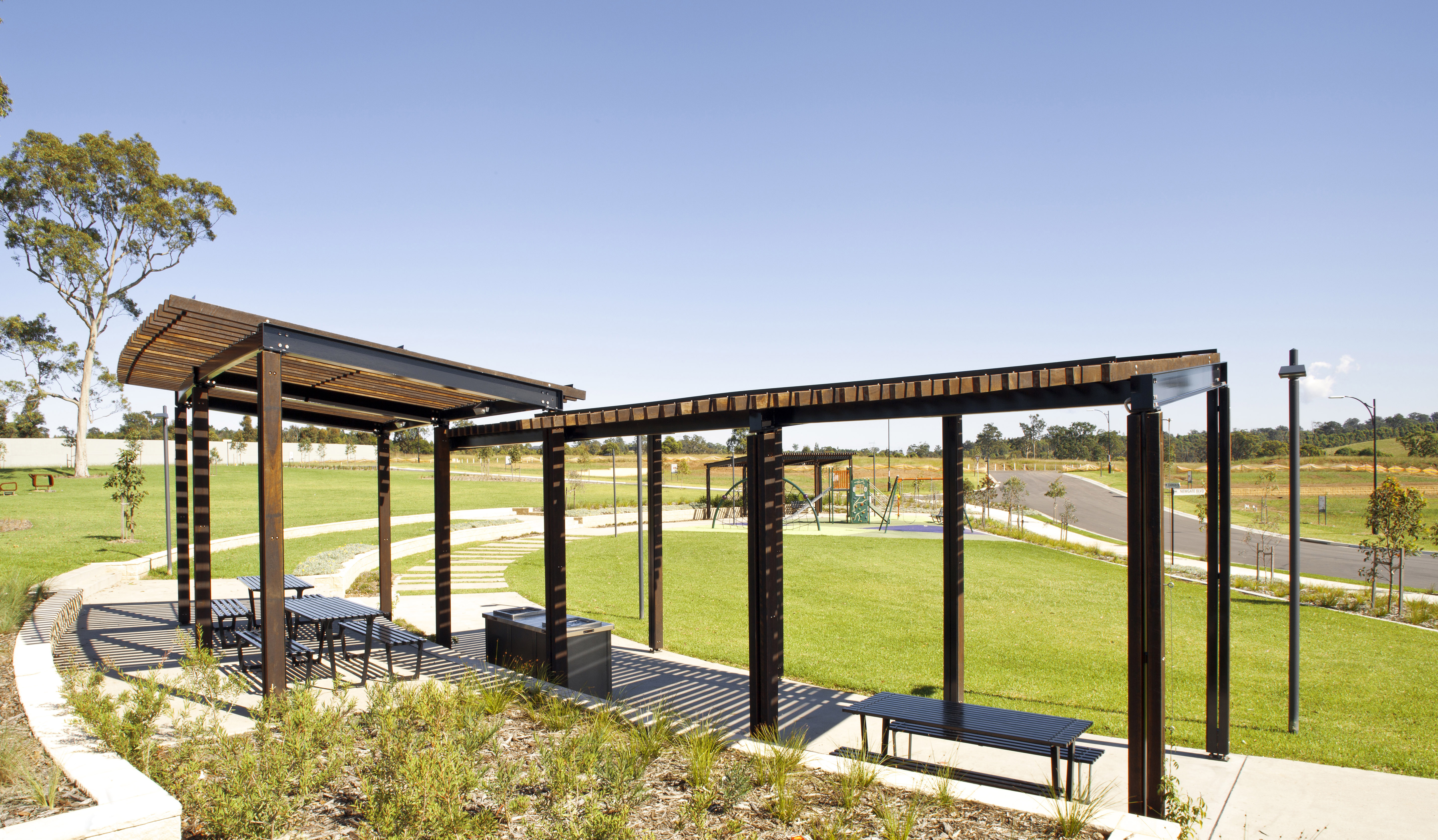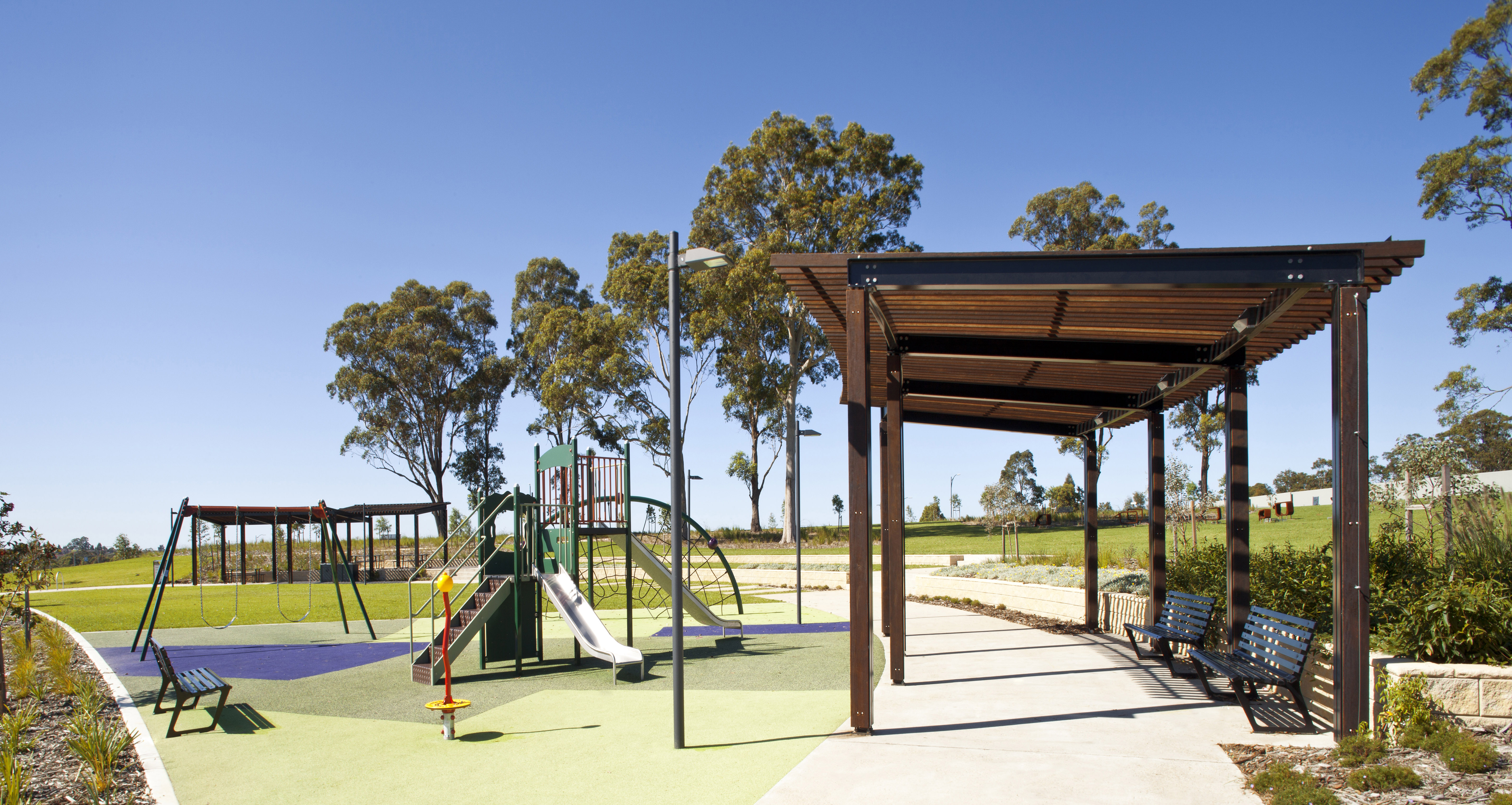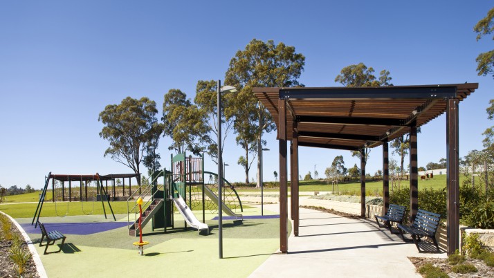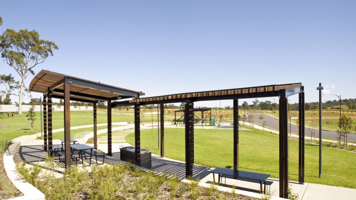 A planned residential estate, Elizabeth Hills contains large areas of open space linking to the Western Sydney Parklands. Best practice environmental design is integrated in the development, with works including wetland design, riparian rehabilitation, creekline reconstruction, bio-engineering, bush regeneration and protection of threatened Cumberland Plain Woodland. The entry bridge, streetscapes, open space corridor, cycle path and timber boardwalks emphasise the visitor experience, with the Hill Top Park providing a playground, BBQ area, shelters and public art.