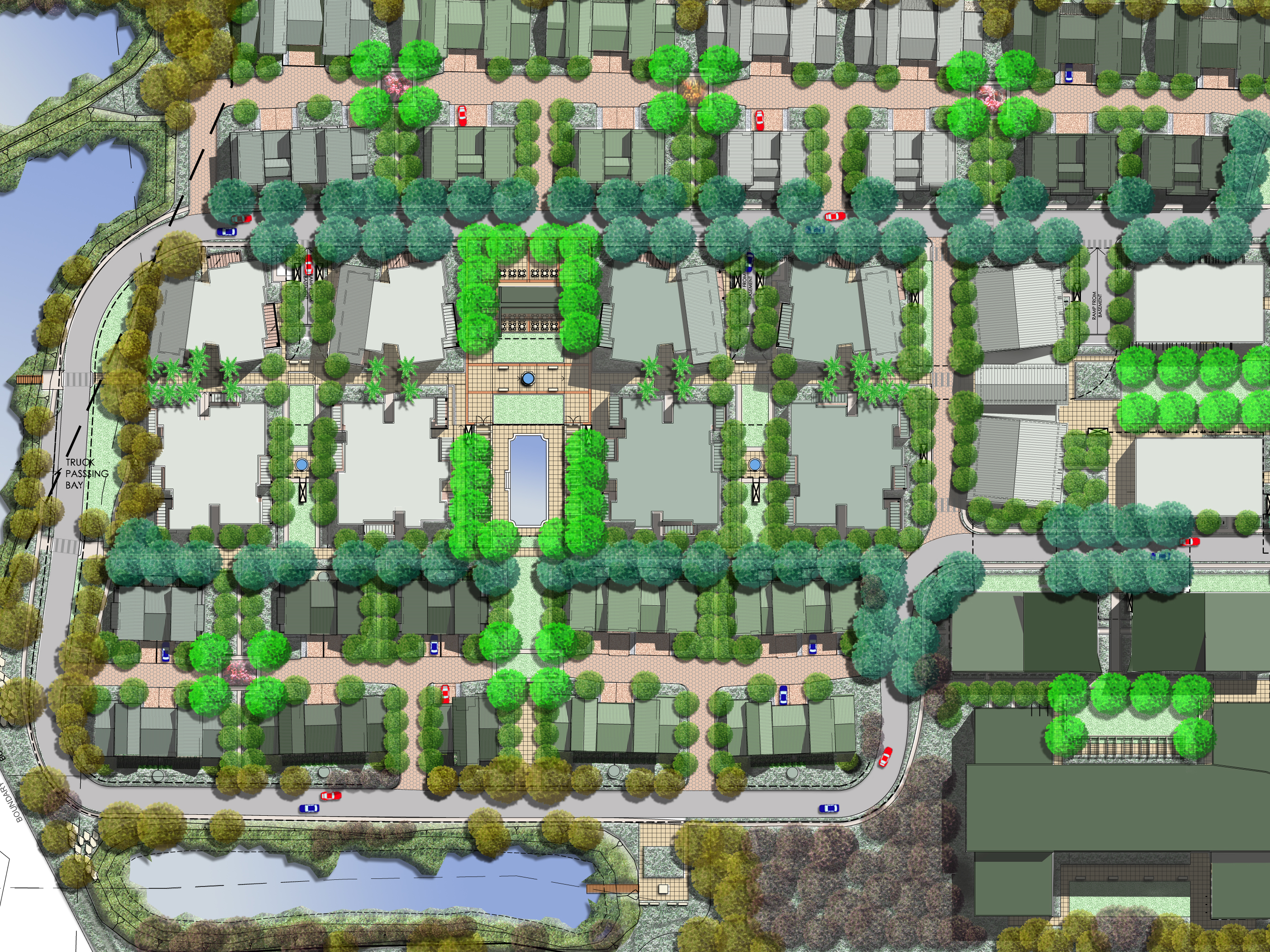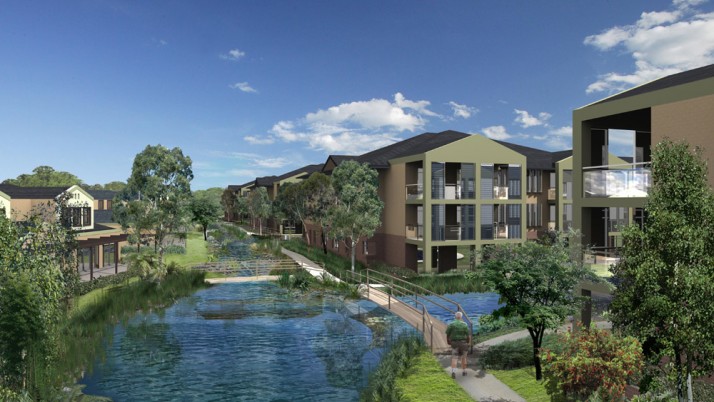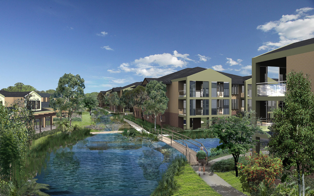 Development of the landscape master plan and concepts for a proposed seniors living development, residential care facility, hostel, activities centre, sport and recreation facilities and independent living accommodation over 9 hectares. The design at the central “piazza” is of high finish, classic style. This centralised open spaces links to the seniors club facilities, gym, outdoor pool, café and restaurant terrace. Set adjacent to existing melaleuca swamp, the bushfire asset protection zone accommodates tennis courts, boules, putting and bowling greens and BBQ facilities & provides a bushland vista and walking circuit for residents.