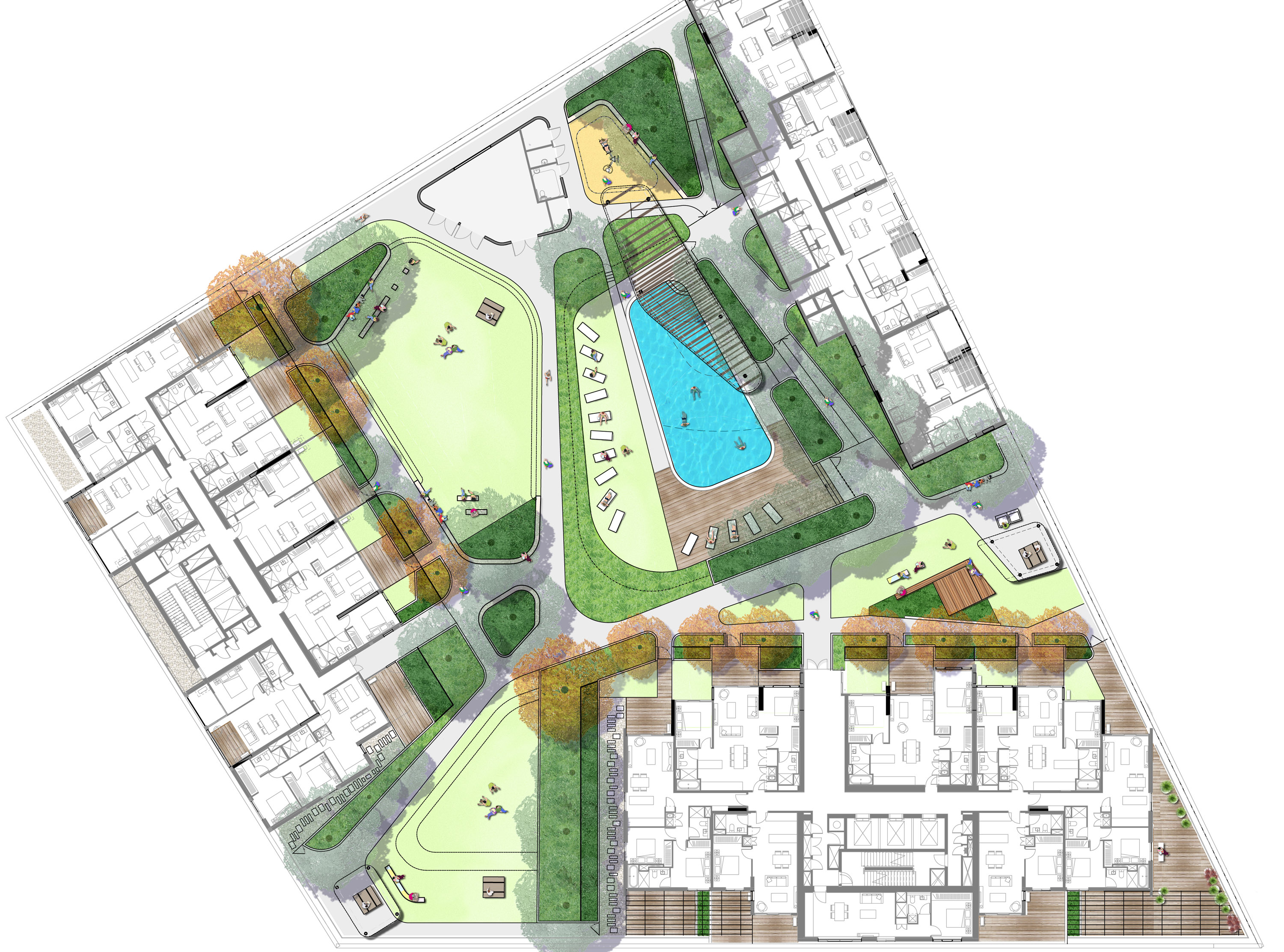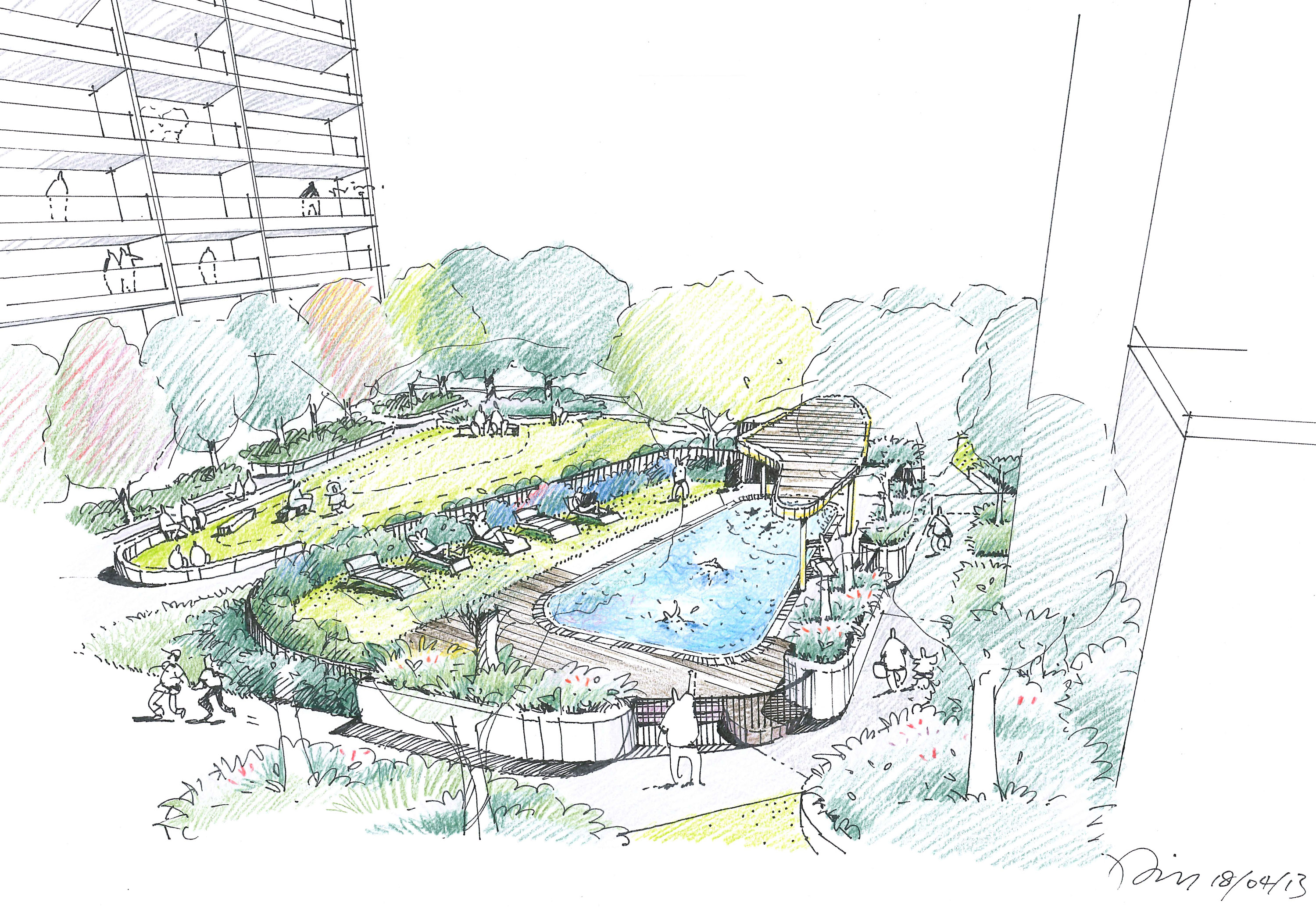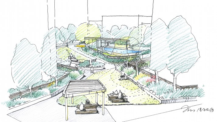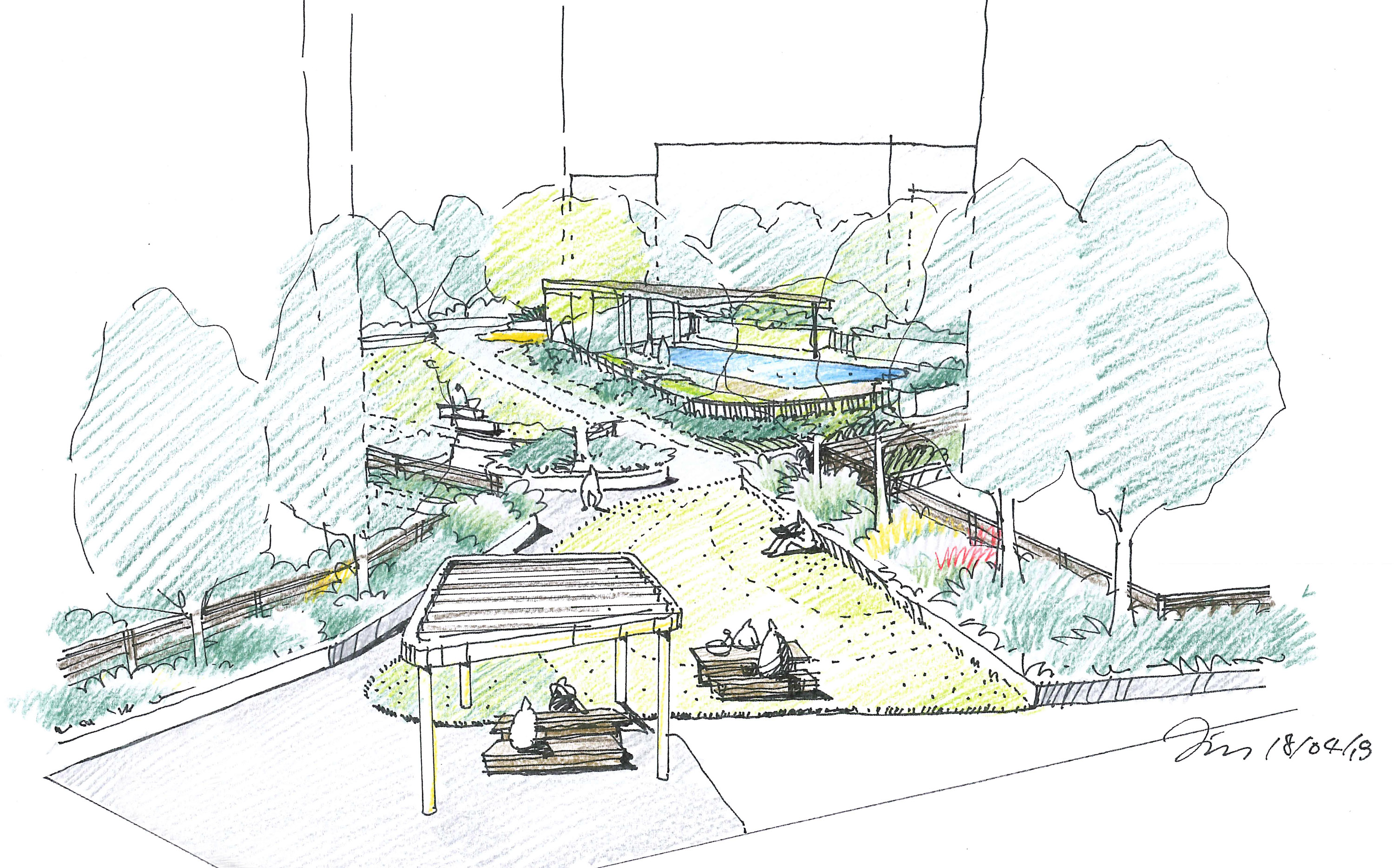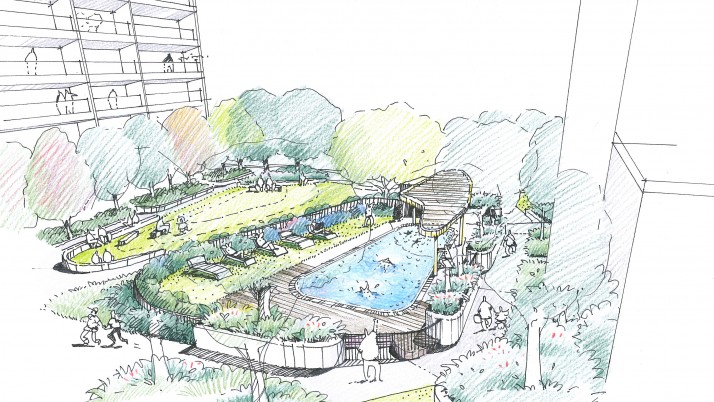 A large communal podium landscape rivalling many city parks. Providing a range of facilities to residents of a Lend Lease development in Darling Harbour. Consisting of a central lawn and park area including extensive swimming pool facilities and outdoor gym.  Sturt Noble also developed the design for the large wing pergola. The main park area branches out to two separate BBQ picnic areas complete with shelters, gardens, casual fixed seating and large shade trees. In situ concrete and timber seating and mounding provide soil volumes for lawn, garden and trees. Note: Reference photographs shown