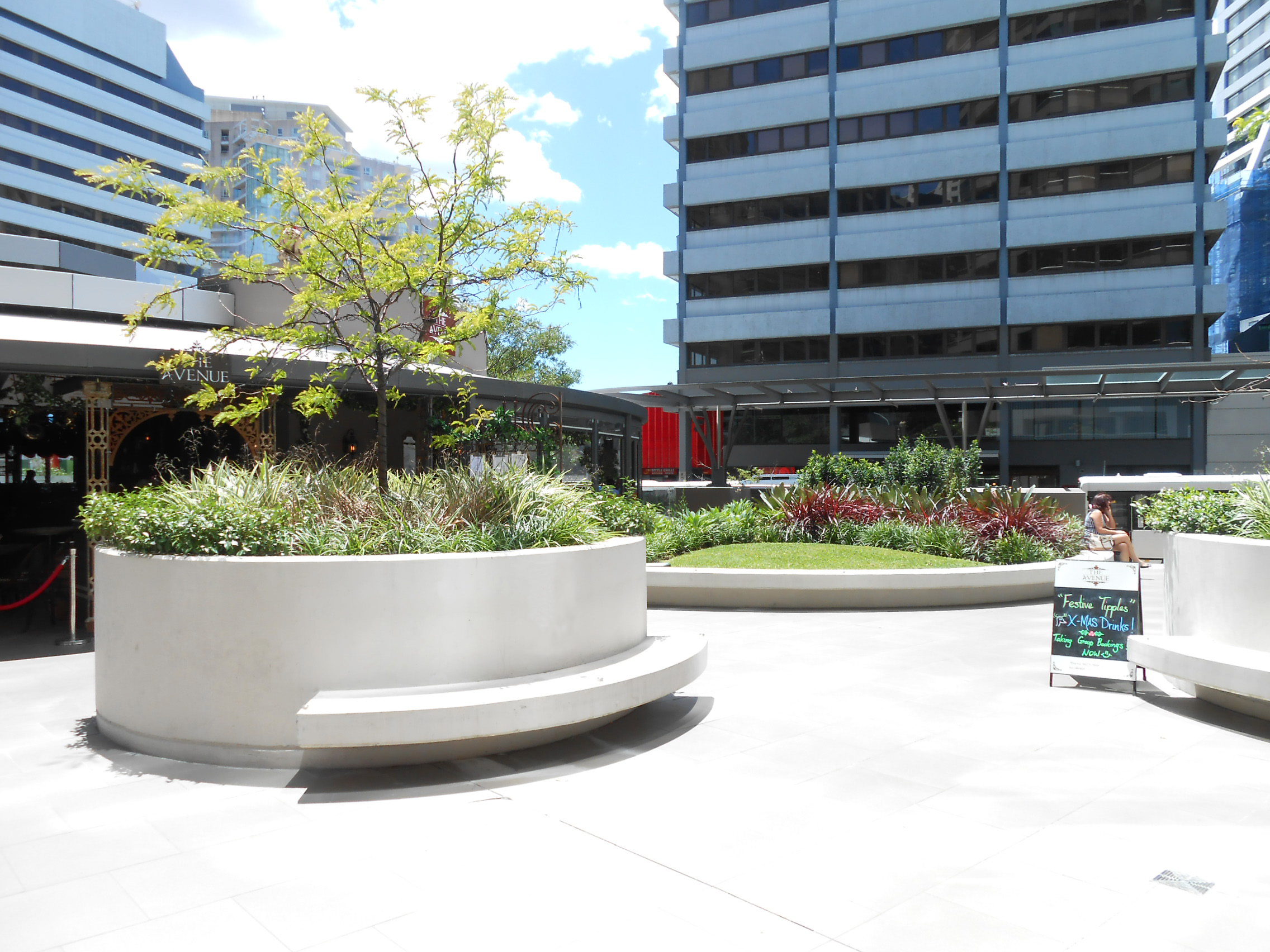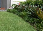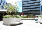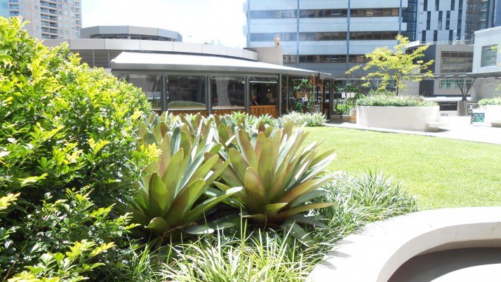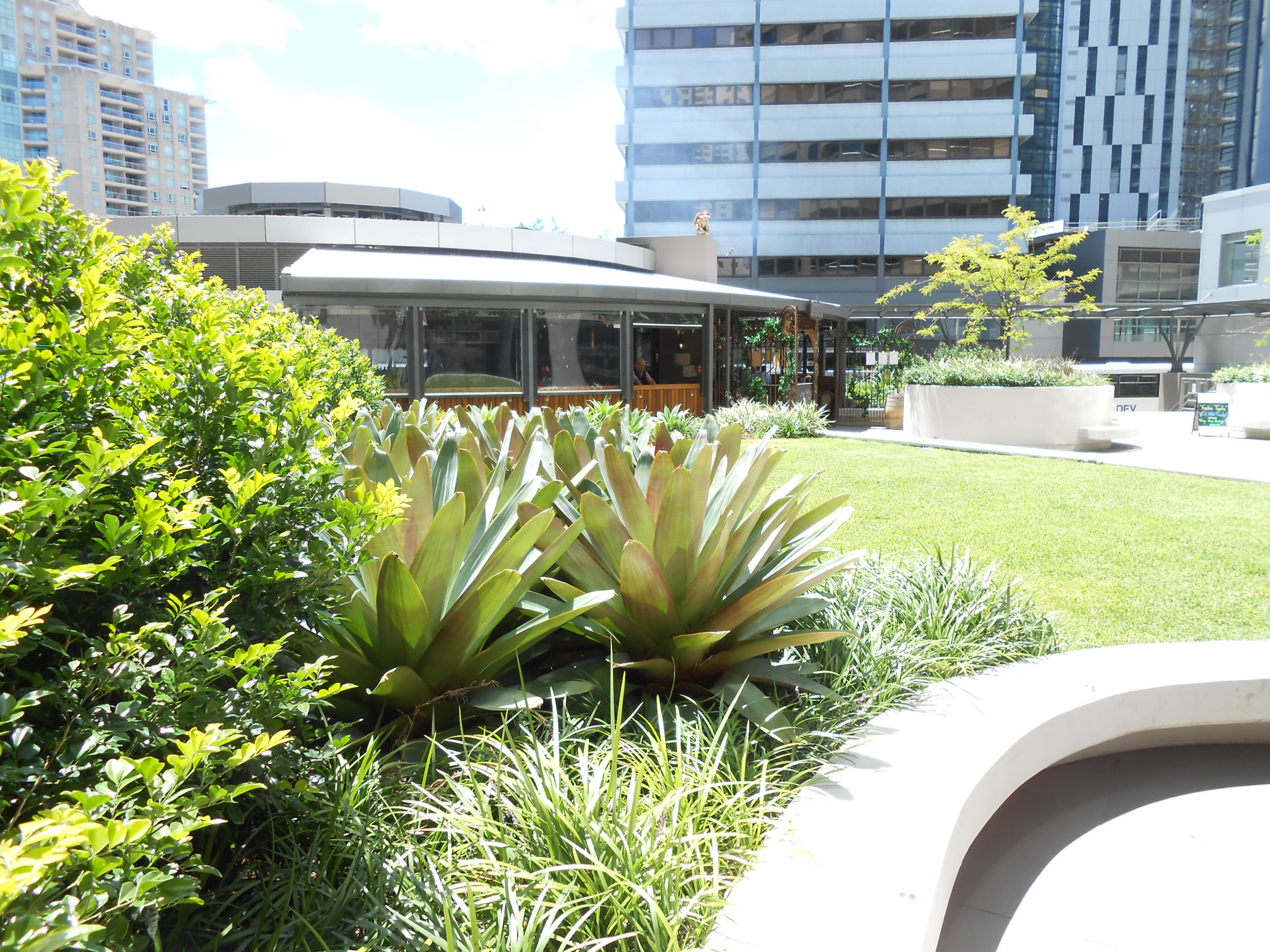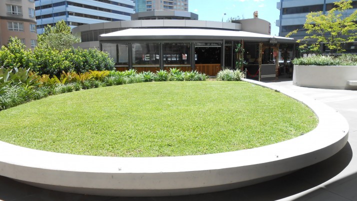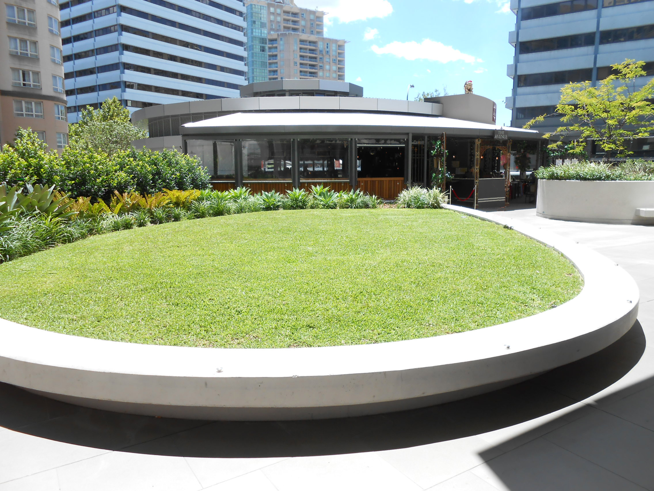 The design of the central plaza of this commercial development within the Chatswood CBD, compliments the stylish transformation of this office and retail centre redesigned to achieve a 5-Star NABERS rating and 4 Star Green Star by awarded architects Krikis Taylor. The central plaza forms the heart of the development, planters and lawns provide a view for offices & visitors to the ground level retail alike. The curvilinear concrete planter walls provide seating for lunch time traffic. Large massed plantings including, Bromeliads, Agaves and Flax provide interest year round.