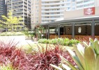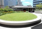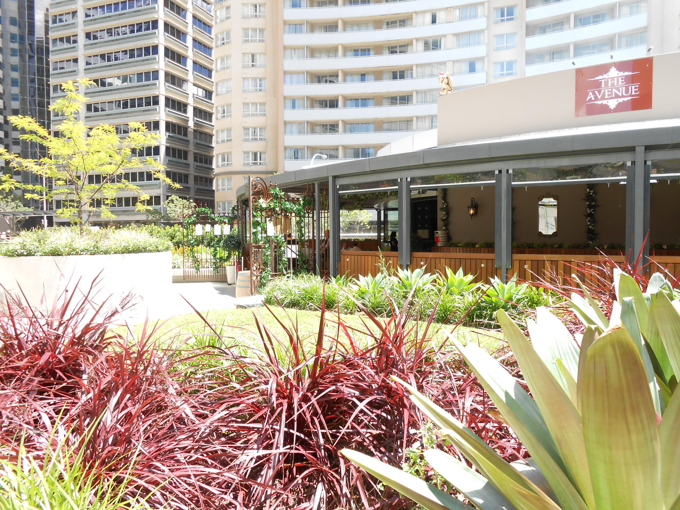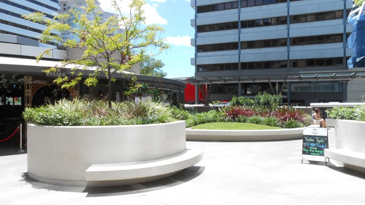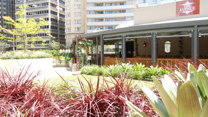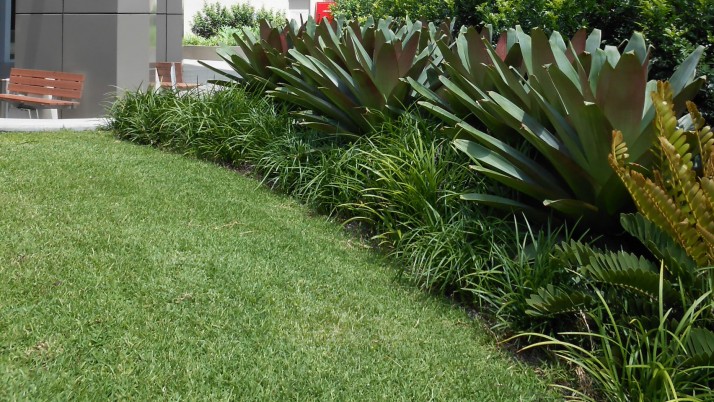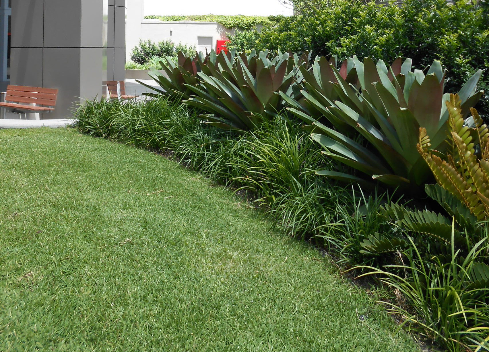 The design of the central plaza of this commercial development within the Chatswood CBD, compliments the stylish transformation of this office and retail centre redesigned to achieve a 5-Star NABERS rating and 4 Star Green Star by awarded architects Krikis Taylor. The central plaza forms the heart of the development, planters and lawns provide a view for offices & visitors to the ground level retail alike. The curvilinear concrete planter walls provide seating for lunch time traffic. Large massed plantings including, Bromeliads, Agaves and Flax provide interest year round.